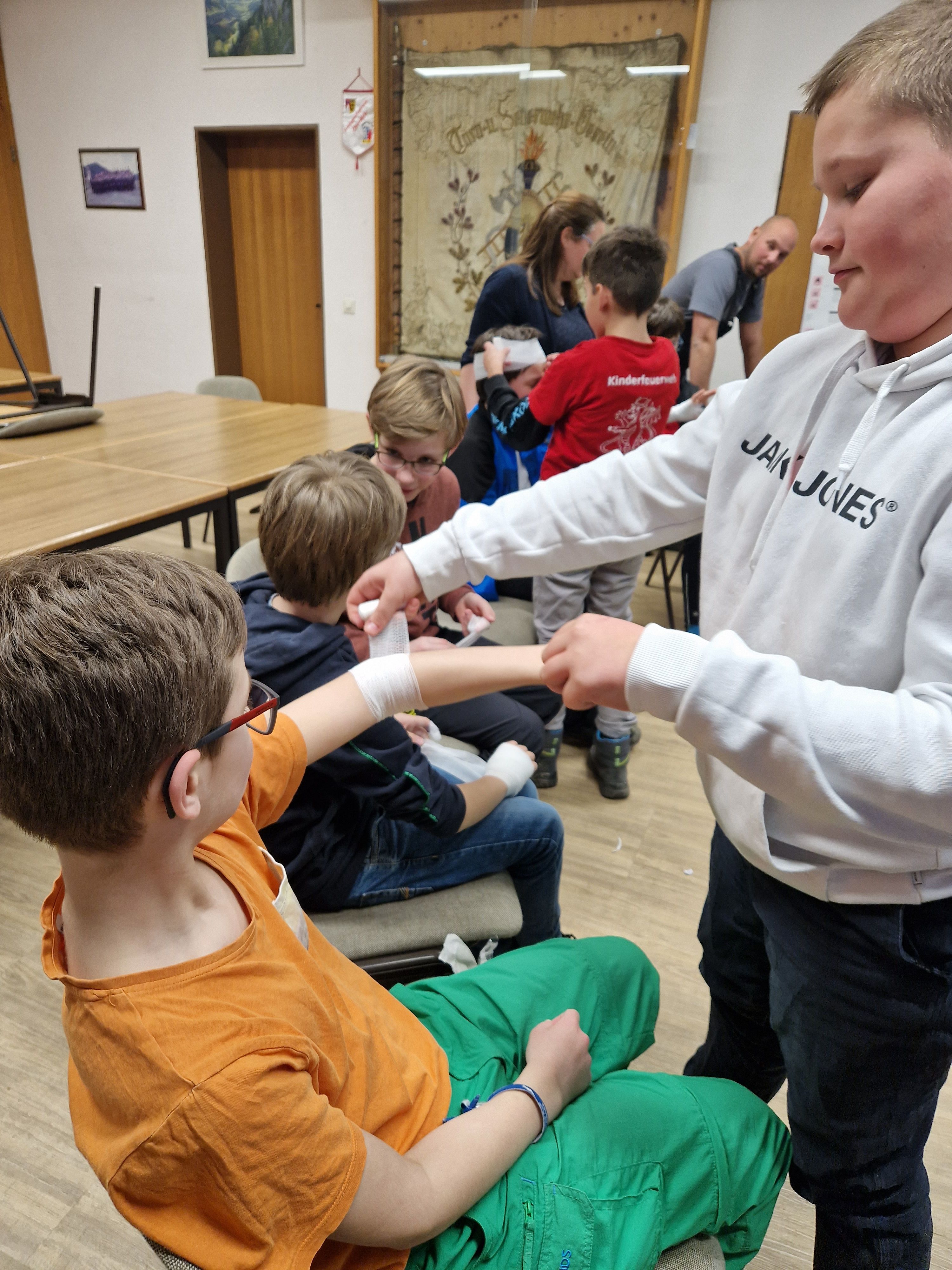 Auf unserem Übungsplan stehen praktische Themen wie Brandschutzerziehung, Löschaufbau und Erste-Hilfe, aber auch theoretische Inhalte wie das Absetzen eines Notrufs oder das Verbrennungsdreieck möchten wir den Kindern auf spielerische Weise näherbringen.