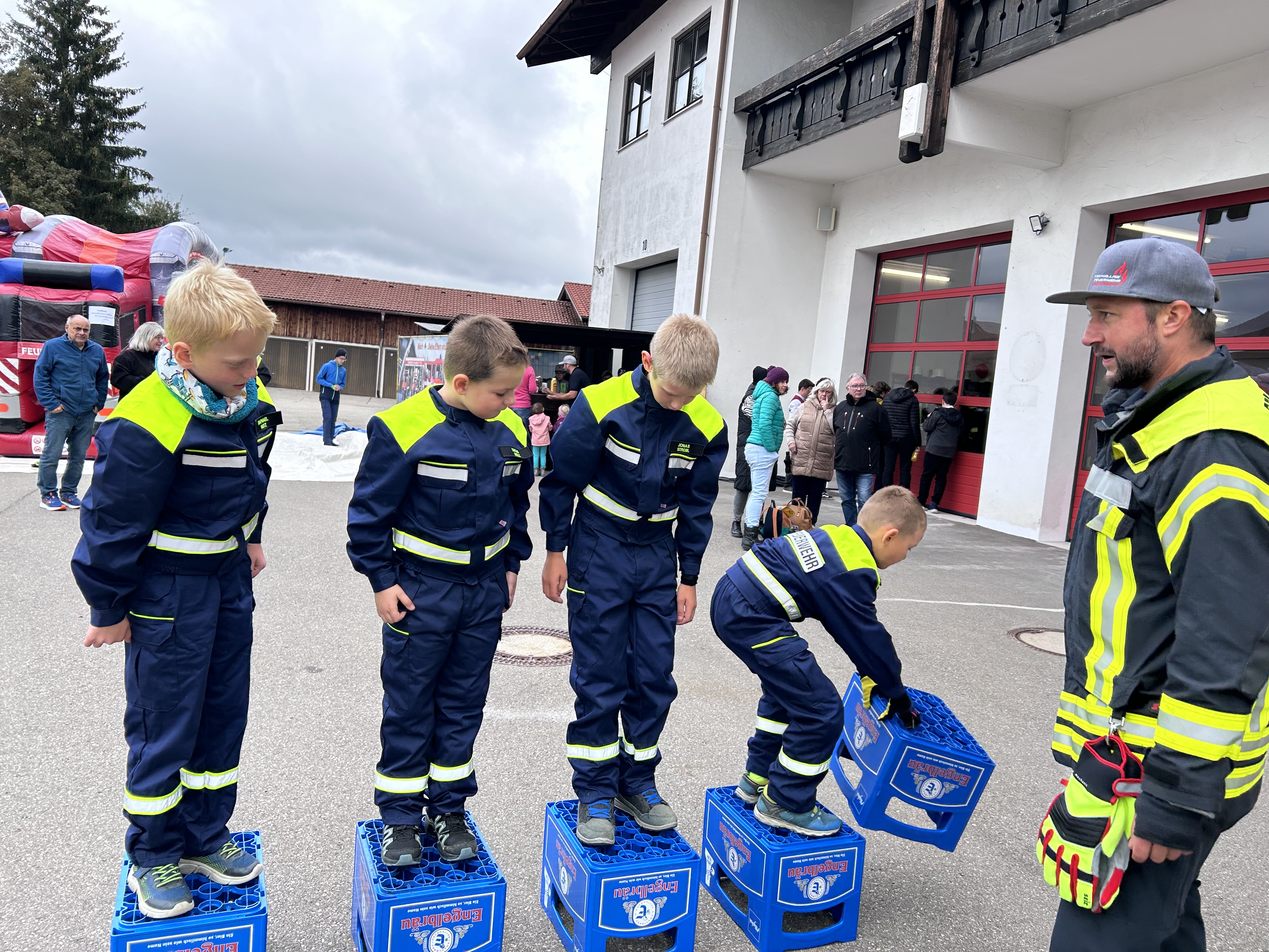 Mit vollem Elan meistern 76 Kinder aus den Kinderfeuerwehren Lauben-Heising, Hegge, Kleinweiler, Sonthofen und Blaichach insgesamt 15 Spielstationen. Manchmal ist Geschick, manchmal Wissen oder auch Kreativität gefragt. Am Feuerwehrhaus in Blaichach war an diesem Tag einiges geboten.